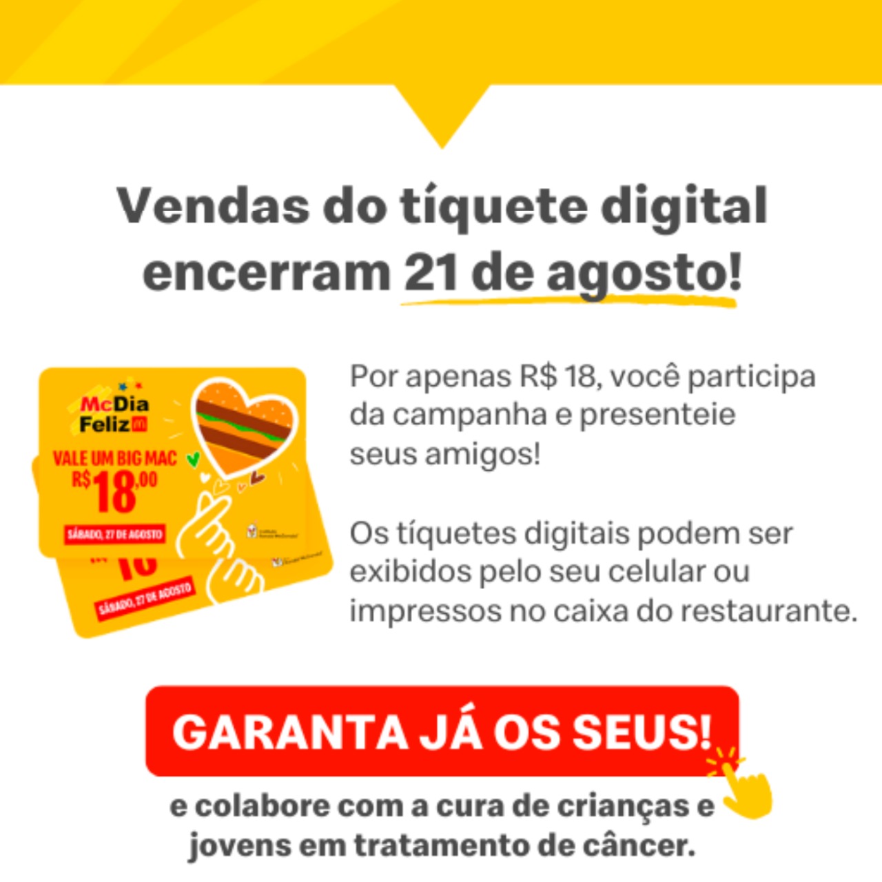 A venda dos tickets do McDia Feliz encerra neste domingo (21). A ação acontece no dia 27 de agosto (sábado) e os tickets custam R$18, valendo um sanduíche BigMac, por meio do link McDia Feliz CDP. O McDia Feliz vai ajudar a ampliar o Projeto Diagnóstico Precoce, que tem por objetivo disseminar informação sobre sinais e sintomas do câncer infantojuvenil e ajudar a salvar ainda mais vidas.