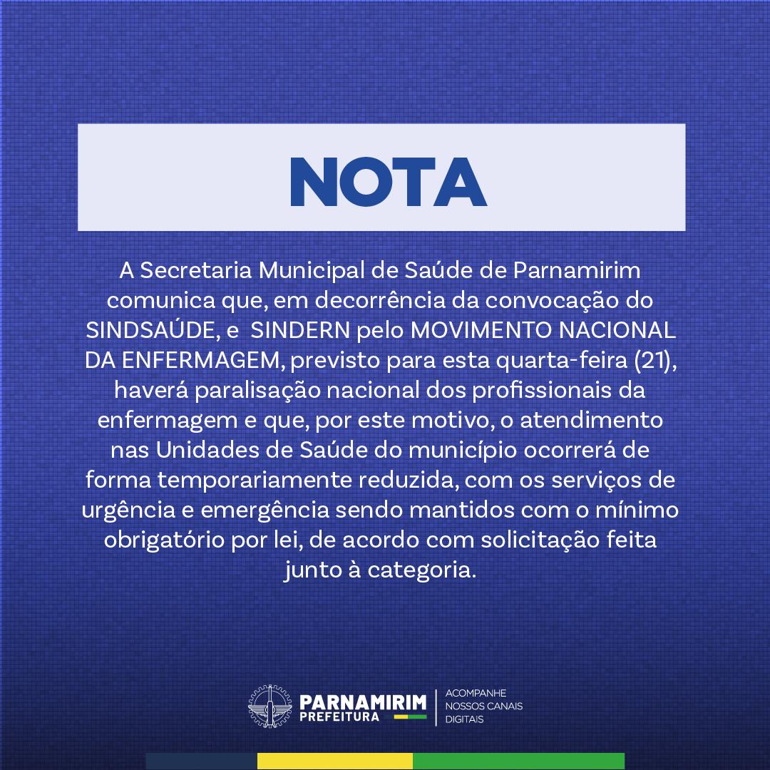 A Secretaria Municipal de Saúde de Parnamirim publicou nota informando que, devido à Paralisação nacional dos profissionais da enfermagem, o atendimento nas Unidades de Saúde do município ocorrerá de forma temporariamente reduzida, com os serviços de urgência e emergência sendo mantidos com o mínimo obrigatório por lei, de acordo com solicitação feita junto à categoria.
