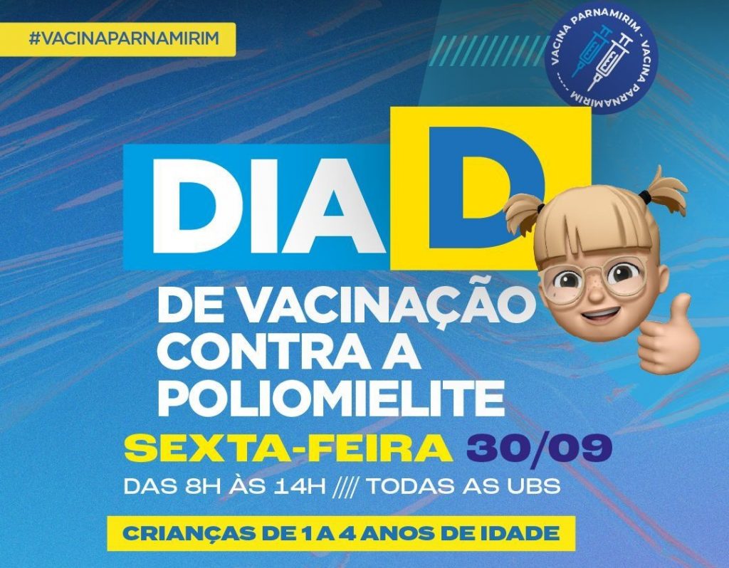 Nesta sexta-feira (30) a Prefeitura de Parnamirim promove o Dia D contra a poliomielite para crianças menores de 5 anos. As aplicações serão feitas nas UBS para dar as gotinhas ao seu filho.