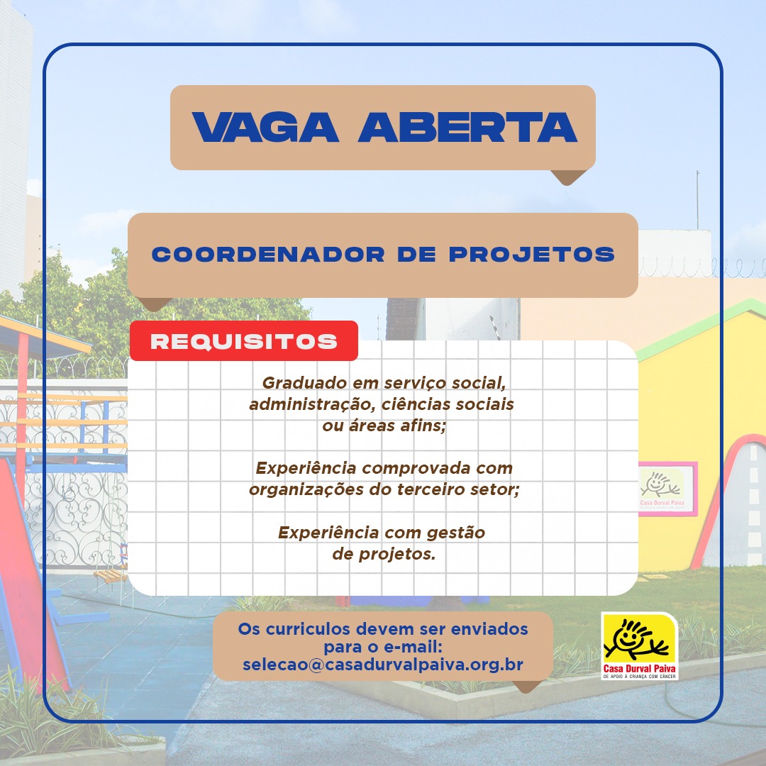 Dentro do trabalho prestado pela Casa Durval Paiva, alguns profissionais são essenciais. No momento, a Casa está com processo seletivo aberto para a vaga de COORDENADOR DE PROJETOS. Os requisitos para a vaga são: Graduação em Serviço Social, Administração, Ciências Sociais ou áreas afins. Experiência comprovada com organizações do terceiro setor e com gestão de projetos. A carga horária é de 44 horas semanais.