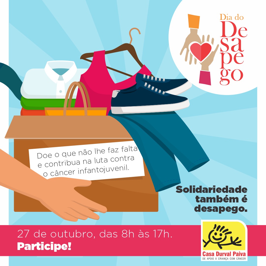 Contribua com a luta contra o câncer infantojuvenil e doenças hematológicas crônicas, através da doação de itens em bom estado de conservação e que você não usa mais. Nesta quinta-feira (27), das 8h às 17h, a Casa Durval Paiva estará realizando o Dia do Desapego.