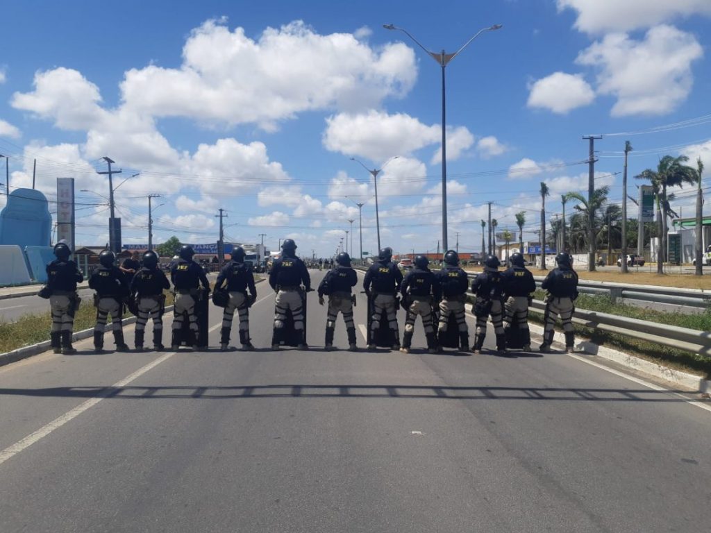 A tropa de choque da Polícia Rodoviária Federal (PRF) está mobilizada no km 104 da BR-101, na altura de Parnamirim, na Grande Natal, para dispersar o bloqueio feito por manifestantes na rodovia.