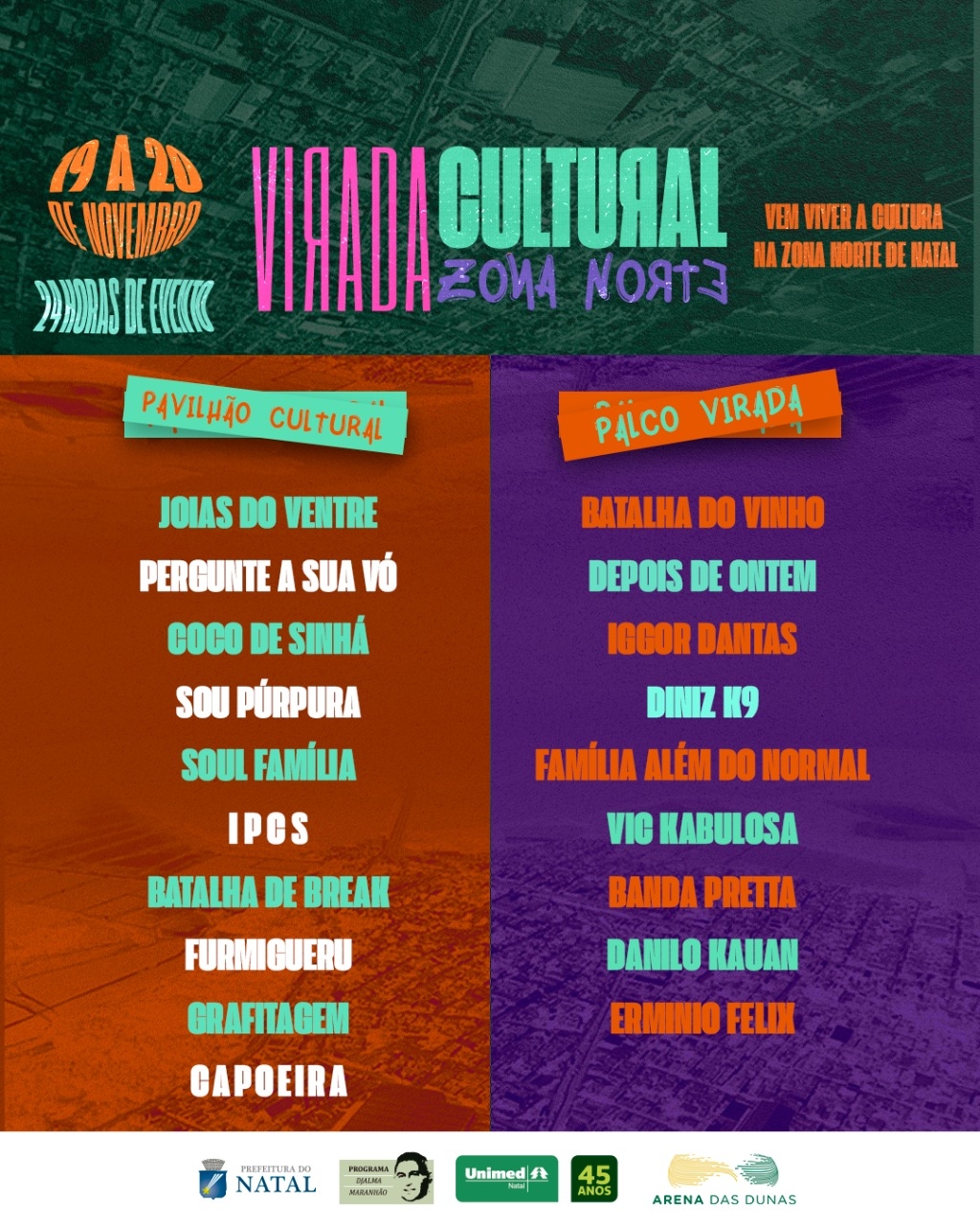 O espaço Cultural Jesiel Figueiredo, na Zona Norte, recebe neste sábado (19) e domingo (20), a primeira Virada Cultural da Zona Norte, com uma programação que reunirá música, arte urbana, gastronomia, artesanato, esporte e dança durante vinte e quatro horas ininterruptas, no estacionamento do Ginásio Nélio Dias. O evento começa às 9h de sábado (19) e vai até 9h do domingo (20) com programação diversa e gratuita para toda a família. Entre as atrações estão DJs, bandas de diversos estilos musicais, coletivo de artistas de rap, coletivos de dança, grafite e roda de capoeira. Além das atrações culturais, haverá ainda uma feirinha gastronômica e de artesanato, com expositores da região. O projeto Virada Cultural tem o patrocínio da Prefeitura do Natal, através da Lei Djalma Maranhão, e integra as ações do Natal em Natal 2022.