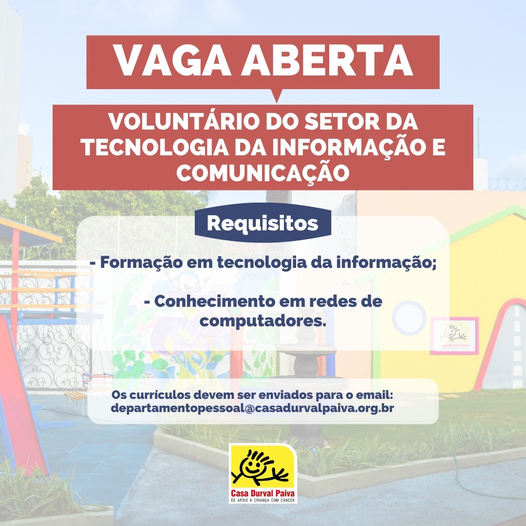 Faça parte do acolhimento realizado pela Casa Durval Paiva. A instituição está em busca de um voluntário, que tenha formação em Tecnologia da Informação e conhecimento em redes de computadores, para ajudar no setor pedagógico, onde acontecem atendimentos da equipe técnica multidisciplinar, dando continuidade ao calendário escolar dos pequenos. Ter experiência na docência será um diferencial.