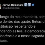 O presidente prometeu que todas as pessoas que participaram da depredação serão punidas pela lei e chamou de irresponsáveis os atos antidemocráticos. “É importante lembrar que a esquerda brasileira teve gente torturada, morta, desaparecida. Nunca vocês leram notícias de gente de esquerda invadindo o Congresso, o Supremo Tribunal Federal e o Palácio do Planalto”, disse.