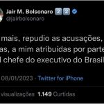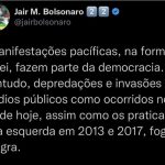 O ex-presidente, Jair Bolsonaro, se manifestou em suas redes sociais repudiando qualquer tipo de depredação do patrimônio público, tanto como as que ocorreram hj como as praticadas pela esquerda em 2013 e 2017.