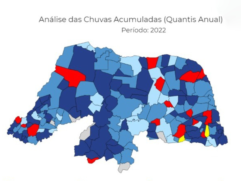 Depois de um ano mais seco (2021), com volume médio de chuva em torno de 600 milímetros (mm) na maior parte do território do Rio Grande do Norte, o Sistema de Monitoramento da Empresa de Pesquisa Agropecuária do Rio Grande do Norte (Emparn) registrou chuvas 39,9% acima do esperado em 2022. O volume acumulado no estado no período foi de 1.165,5 mm enquanto que o esperado era de 833,2 mm. As precipitações ocorreram com boa distribuição temporal e espacial em todas as regiões do Estado. De acordo com as análises, somente o mês de fevereiro registrou volumes abaixo do esperado.