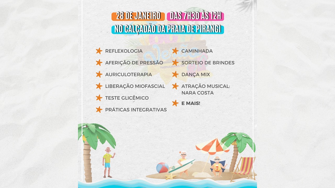A Prefeitura de Parnamirim por meio da Secretaria Municipal de Assistência Social (Semas) e integração das secretarias municipais de Esporte e Lazer (Sel), Saúde (Sesad) e Secretaria de Cultura (Semuc), realizará no próximo sábado (28), no calçadão de Pirangi, a primeira edição do Projeto “60+ Verão”, o qual é parte integrante do Verão Parnamirim 2023.