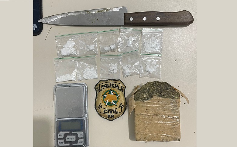 No primeiro imóvel, nada foi encontrado; mas, no segundo, na posse de uma adolescente e de um homem de 19 anos, foram encontradas e apreendidas: uma balança de precisão, embalagens plásticas com zíper, cerca de 10 gramas de cocaína, divididas em dez porções prontas para venda e um tablete de maconha, com aproximadamente 215 gramas.