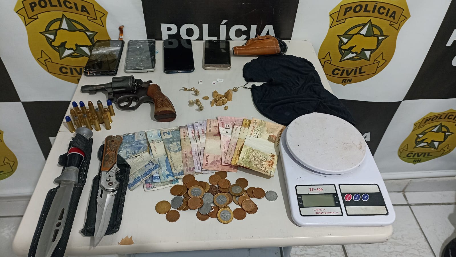 Na posse dos dois, foram encontrados e apreendidos: quatro aparelhos celulares quebrados; um revólver de calibre 38; quinze munições de igual calibre; vinte e uma porções de “crack”; dinheiro fracionado, totalizando cento e vinte e oito reais; e uma balança de precisão.