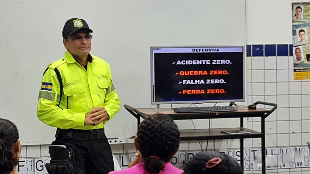 O agente de trânsito municipal Lucas Oliveira foi o responsável pela exposição de um conjunto de conhecimentos e práticas extremamente úteis para uma das turmas da Escola Manoel Machado, no Parque Industrial.