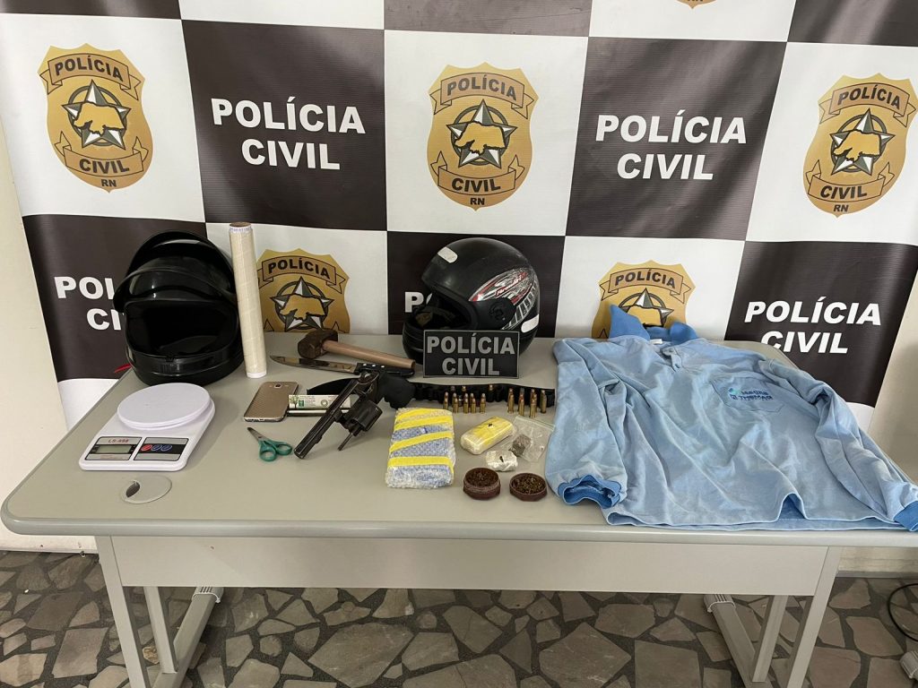 Durante as diligências, também foi cumprido um mandado de busca e apreensão em uma residência localizada no bairro Dom Jaime Câmara. Ao todo, na posse do suspeito, foram encontrados e apreendidos: um revólver de calibre 38; munições de pistola 9 milímetros; uma balança de precisão; cerca de 700 (setecentas) gramas de maconha; embalagens plásticas; uma motocicleta da marca Honda, de modelo XRE, a qual possivelmente foi utilizada na prática do homicídio; e as roupas utilizadas pelo suspeito no dia do crime.