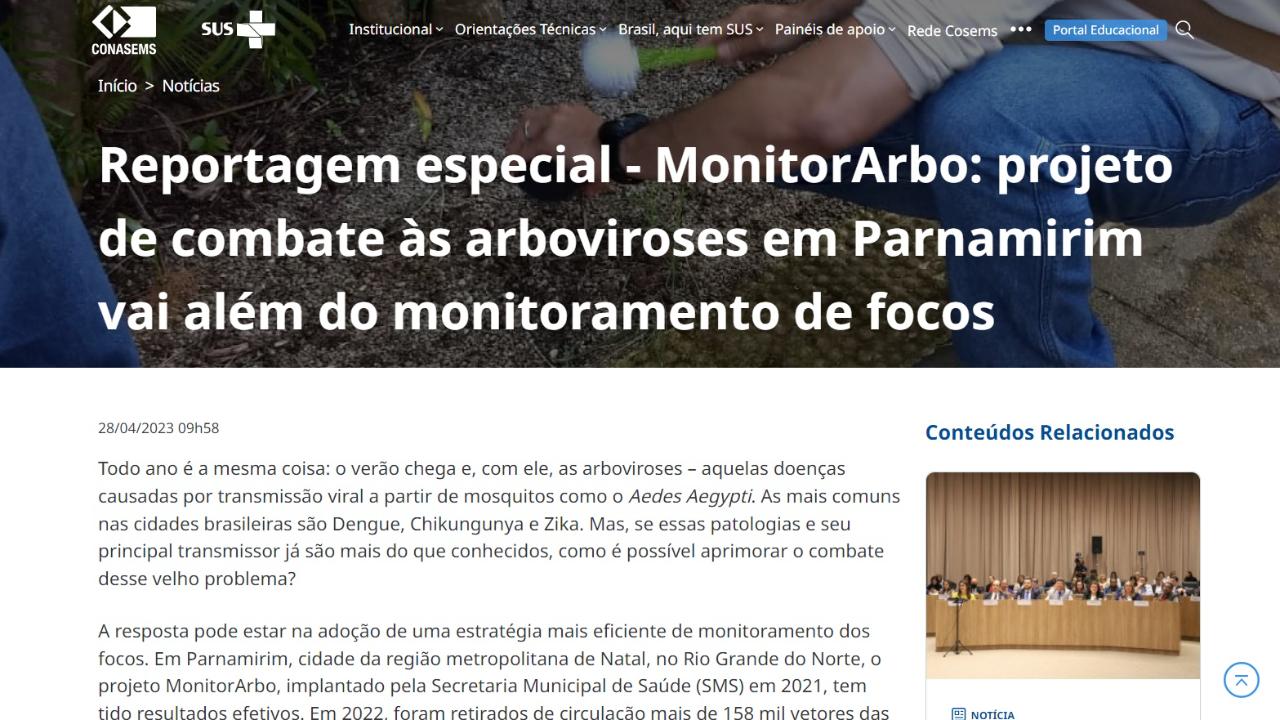 Mais uma vez a cidade de Parnamirim é destaque nacional, desta feita pela atuação exemplar também na saúde pública. O portal do Conselho Nacional de Secretarias Municipais de Saúde (Conasems) publicou na última sexta-feira (28), uma reportagem especial, na qual faz reiterados elogios à atuação dos ACE’s parnamirinenses na condução do projeto MonitorArbo.