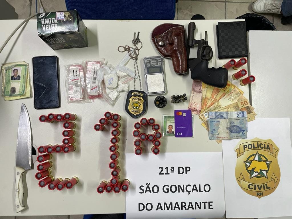 Policiais civis da 21ª Delegacia de Polícia (DP de São Gonçalo do Amarante) prenderam em flagrante, nesta quarta-feira (03), um homem suspeito por tráfico de drogas. Na posse dele, foram encontrados: um revólver, munição de calibre 12, porções de cocaína e objetos utilizados no tráfico de drogas.