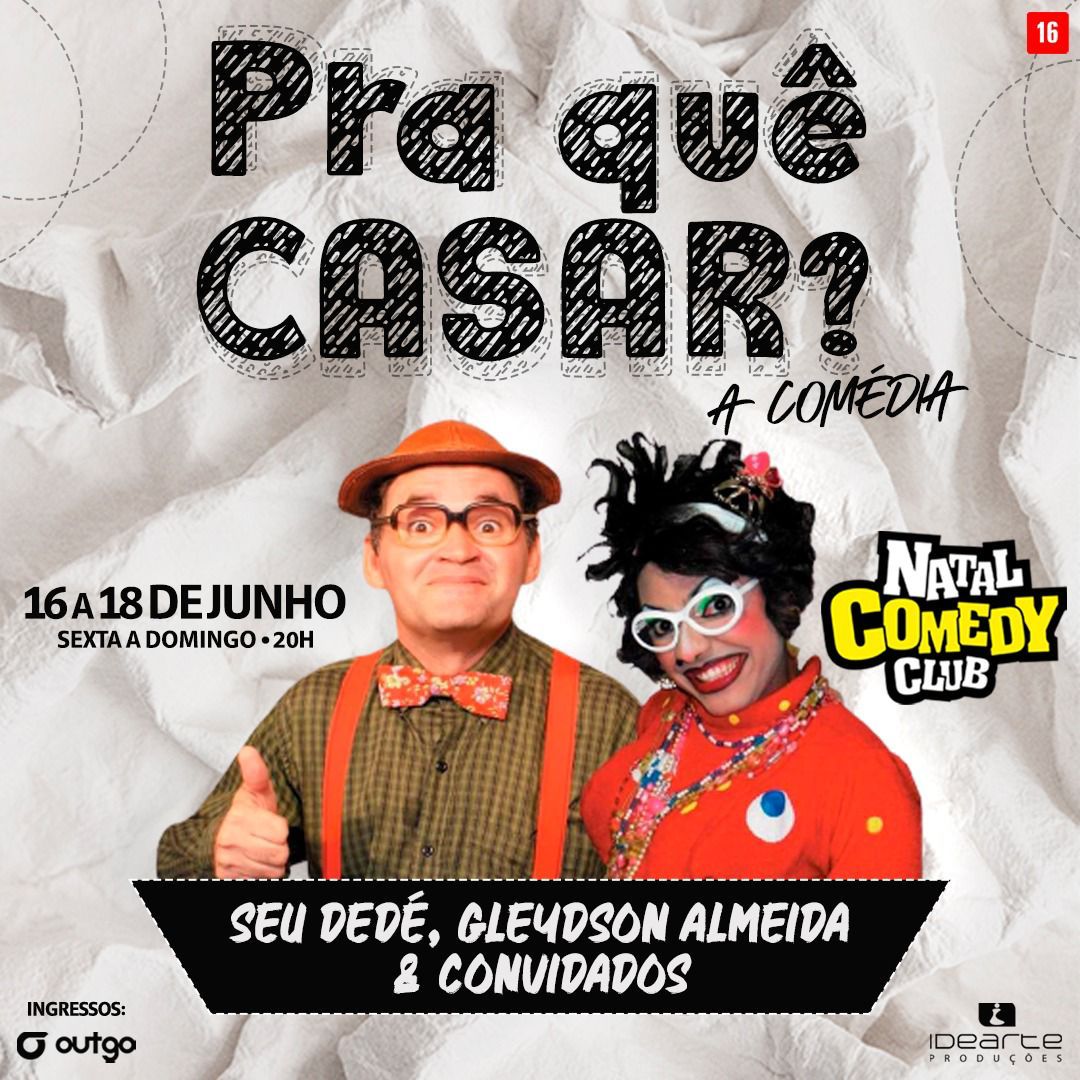 De sexta a domingo, o Natal Comedy Club recebe a comédia “Pra quê casar?” idealizada pelo ator e produtor João Ricardo Costa da Silva, 52 anos, conhecido como “Seu Dedé”. O espetáculo retrata o dia a dia do casal Seu Dedé e Jesusinha, pais de três filhos e companheiros há 20 anos. A sinopse da peça apresenta Jesusinha, uma dona de casa revoltada porque o marido não trabalha, enquanto ela faz bicos para sustentar a família. Mesmo sem trabalhar, Seu Dedé que se acha um galã aguarda ansioso a aposentadoria.