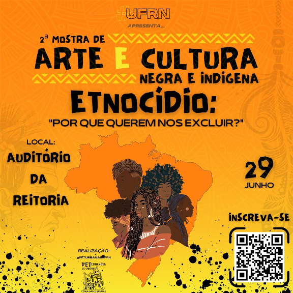 Acontece no dia 29 de junho a 2ª Mostra de Arte e Cultura Negra, com o tema Etnocídio: por que querem nos excluir?. Contando com uma mesa-redonda e exposições de arte tradicional, o evento vai ocorrer no auditório da reitoria da UFRN. Para se inscrever, basta preencher este formulário até o dia 28.