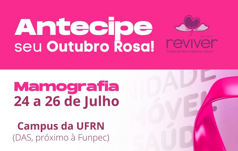 Antecipar o Outubro Rosa e realizar a mamografia para prevenir o câncer de mama. Para isso, a Diretoria de Qualidade de Vida, Saúde e Segurança no Trabalho (DAS), vinculada à Pró-Reitoria de Gestão de Pessoas (Progesp) da UFRN, em parceria com o Grupo Reviver Natal, vai realizar um mutirão de mamografias, nos dias 24, 25 e 26 de julho, voltado para mulheres com idades entre 40 e 75 anos.