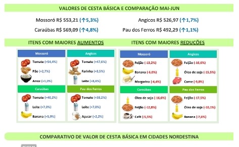 Em Angicos, o valor médio da cesta básica em junho foi de R$ 526,97, o que representa um aumento de 1,7% em relação ao mês anterior. No acumulado do ano, houve um aumento de 3,6%.