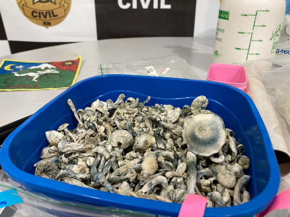 “São produtos conhecidos popularmente como cogumelos mágicos, por eles terem substâncias alucinógenas, como a psilocibina e a psilocina”, afirmou o perito Clélio Soares, do Instituto Técnico-Científico de Perícia (Itep).
