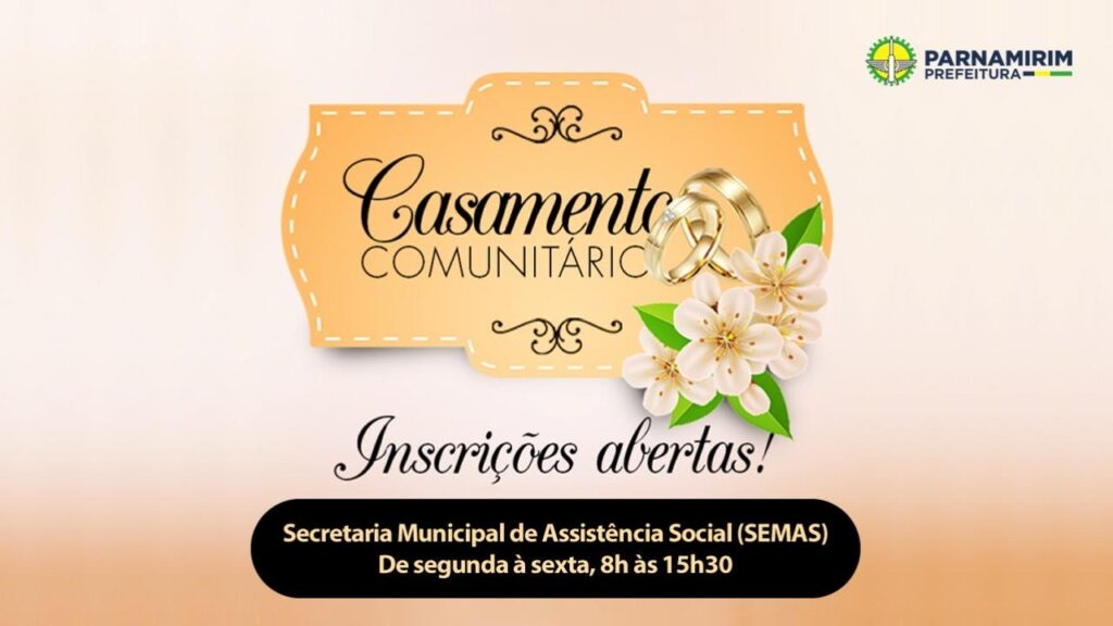A Prefeitura de Parnamirim, através da Secretaria de Assistência Social (SEMAS); o Tribunal de Justiça do Rio Grande do Norte (TJRN); e o 2º Ofício de Notas, realizarão mais uma edição do Casamento Comunitário. A cerimônia vai acontecer no dia 04 de setembro, no Centro Administrativo da Cohabinal, e vai contemplar 50 casais que desejam oficializar suas uniões em efeito civil e religioso.