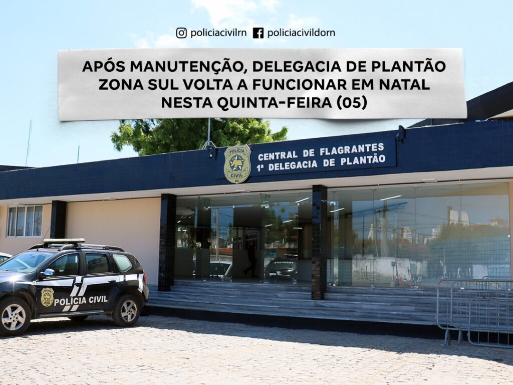 Após um trabalho de manutenção e adequação, os serviços da 1ª Delegacia de Plantão da Zona Sul de Natal e da Central de Flagrantes retornam nesta quinta-feira (05) para o bairro Cidade da Esperança, Zona Oeste de Natal, na Av. Interventor Mário Câmara.