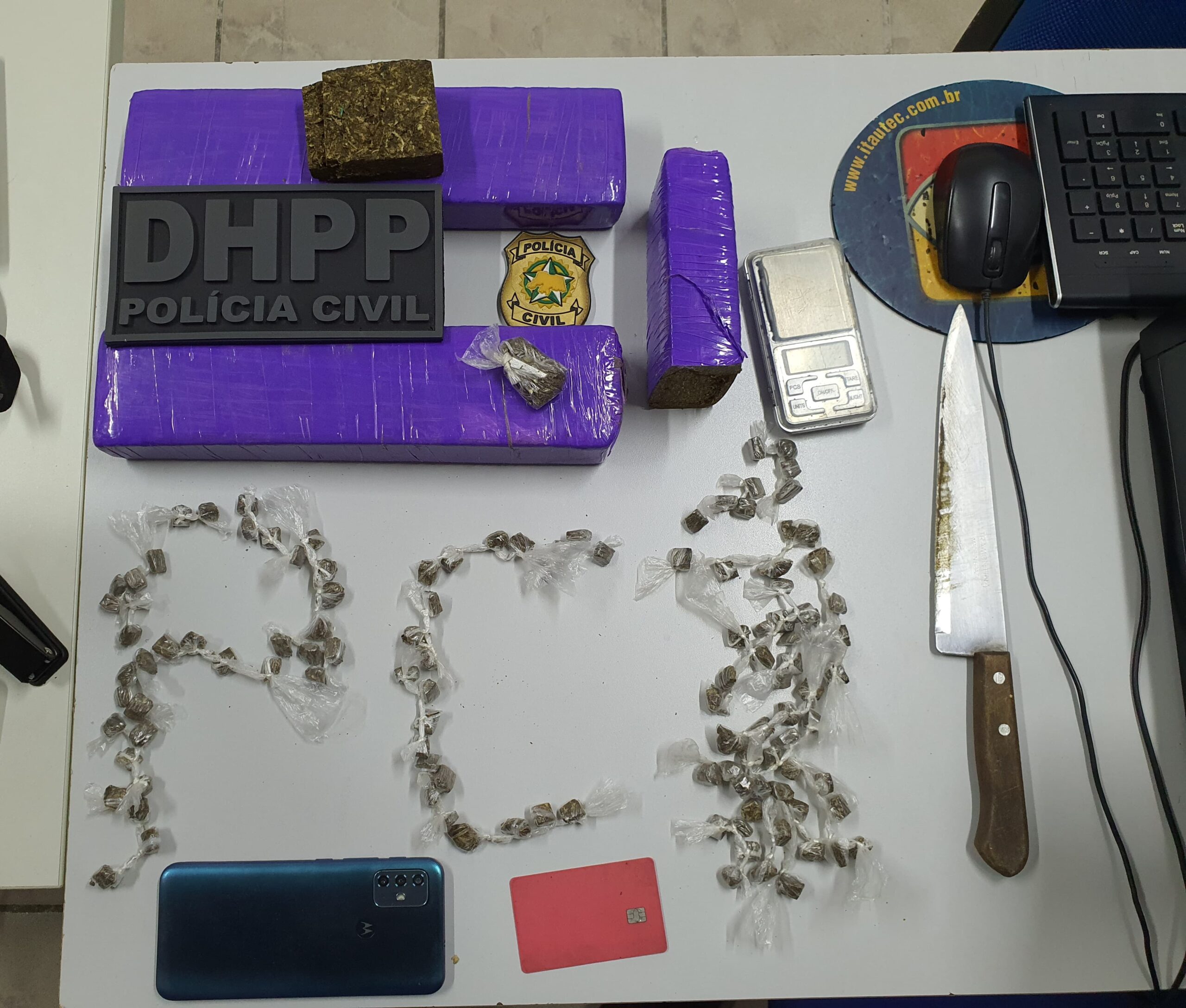 Na posse do homem preso, foram apreendidos dois tabletes de maconha, 116 trouxas de maconha fracionada, uma faca tipo peixeira, uma balança de precisão, um aparelho celular e três porções de tamanho médio de maconha.