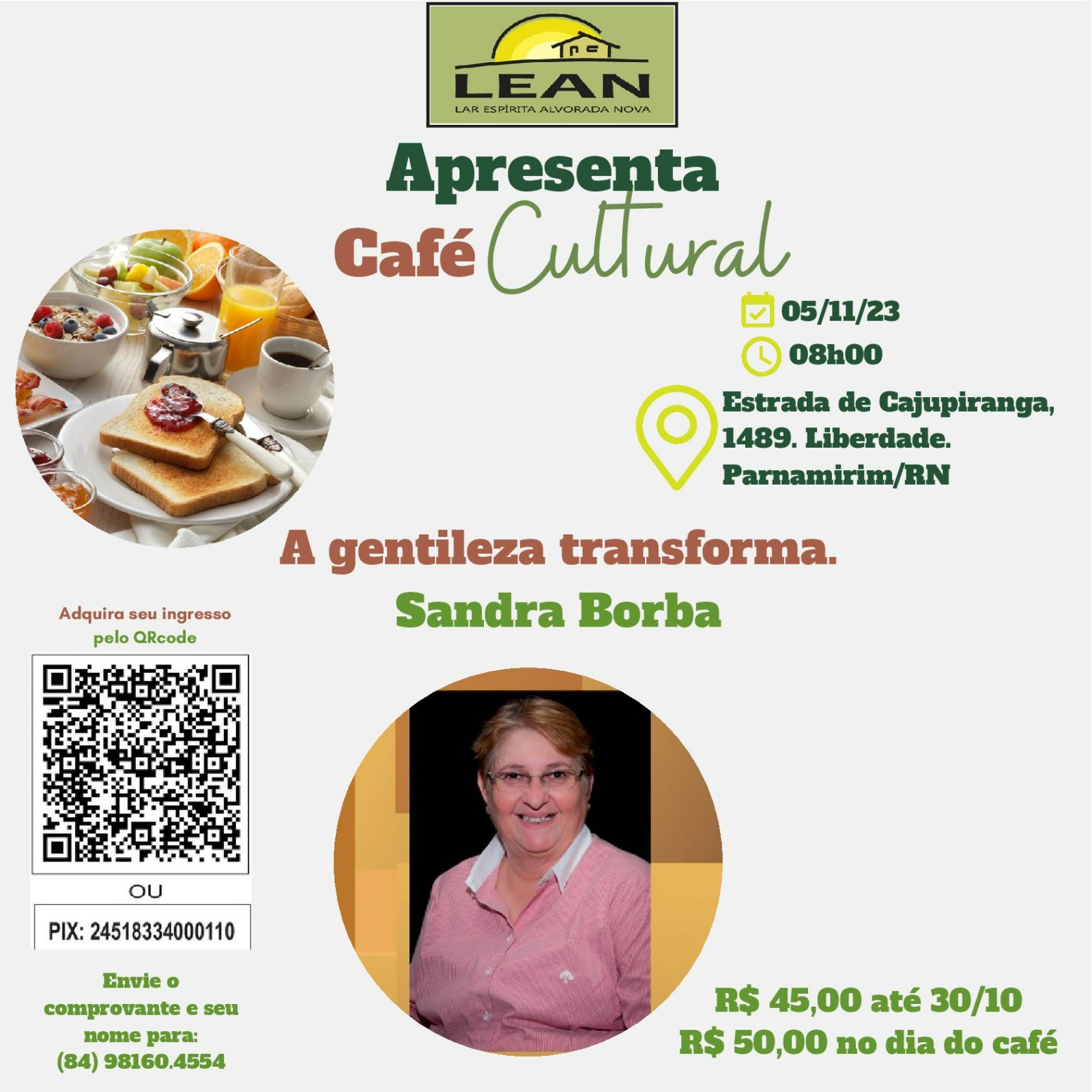Neste domingo o Lar Espírita Alvorada Nova (LEAN) promove mais um Café Cultural, para arrecadar fundos em prol dos idosos acolhidos pela casa. A entrada está custando R$ 45,00 antecipada, podendo ser adquirida pelo QR Code, ou na entrada do evento por R$ 50, 00 (cinquenta reais).
