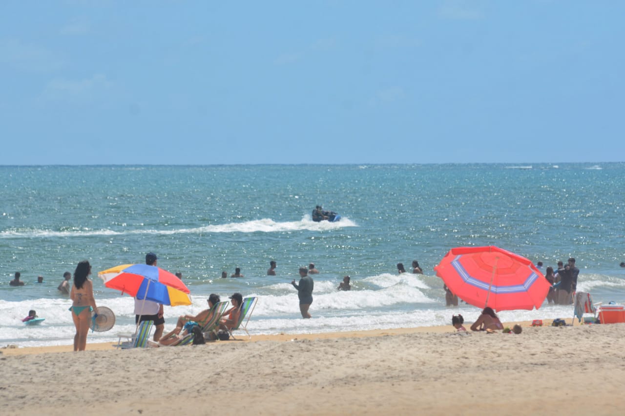 No domingo, a orla estava movimentada. Banhistas de todas as idades aproveitaram o sol para relaxar na areia, nadar no mar ou praticar esportes.