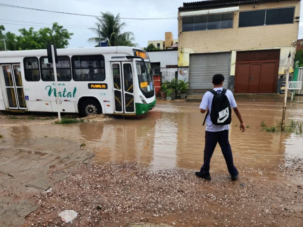 De acordo com comunicado da Secretaria de Mobilidade Urbana de Natal, há pelo menos 10 pontos de alagamento nas ruas da cidade em vias com fluxo razoável de carros. A orientação é para que os motoristas tenham atenção redobrada.
