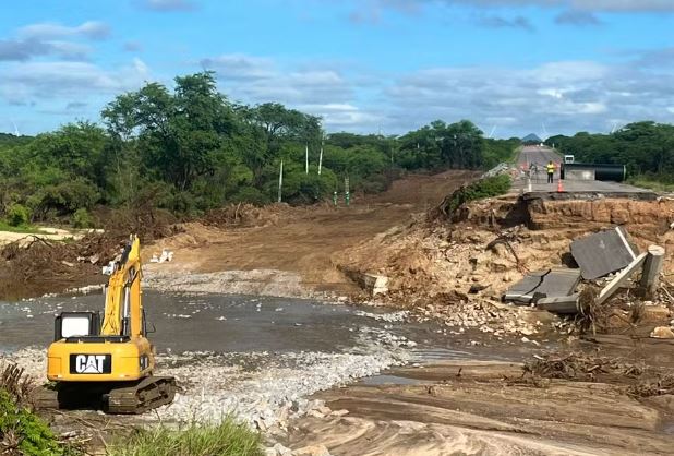 O órgão informou que realizou no trecho serviços como a limpeza da área, regularização do subleito e terraplenagem. Até está terça (23), o Dnit estava colocando uma camada drenante com pedra rachão e brita graduada, e também instalava a tubulação de um bueiro para o fluxo do rio.