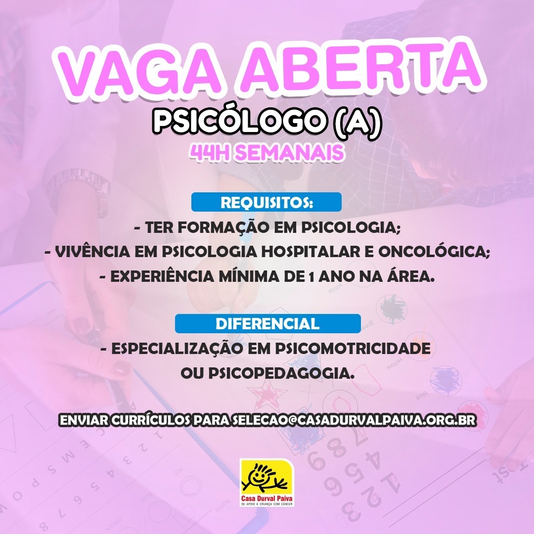 Para o cargo, é necessário ter formação em psicologia, vivência em psicologia hospitalar e oncológica, além de experiência mínima de 1 ano na área. Será um diferencial, ter especialização em psicomotricidade ou psicopedagogia.