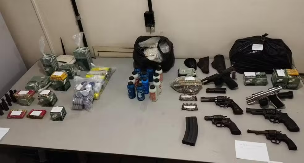 A Polícia Civil encontrou com o flagranteado e na sua residência o total de seis armas de fogo, aproximadamente 27 quilos de pólvora, 22 quilos de chumbo, 60 mil espoletas, carregadores de fuzil e pistola, mais de 300 munições, mais de 250 estojos de munições e 12 calibradores de recargas de cartuchos diversos.