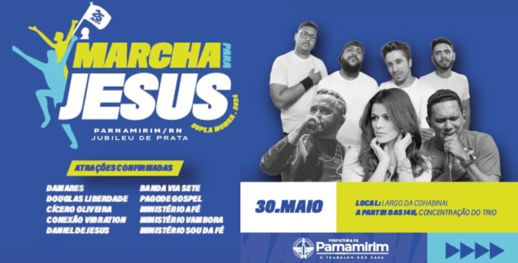 A Prefeitura de Parnamirim, por meio das secretarias de Turismo e Desenvolvimento Econômico (Setude) e de Cultura (Semuc), convida toda a comunidade para a 25ª edição da Marcha para Jesus, um dos eventos mais importantes para a comunidade evangélica da cidade. O evento ocorrerá no dia 30 de maio, a partir das 14h, no Largo da Cohabinal.