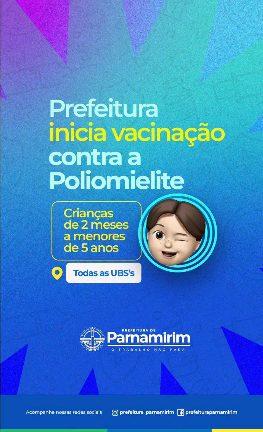 A Prefeitura de Parnamirim lança a Campanha de Vacinação contra a Poliomielite. A população de Parnamirim pode procurar as UBS da cidade para vacinar seus filhos.