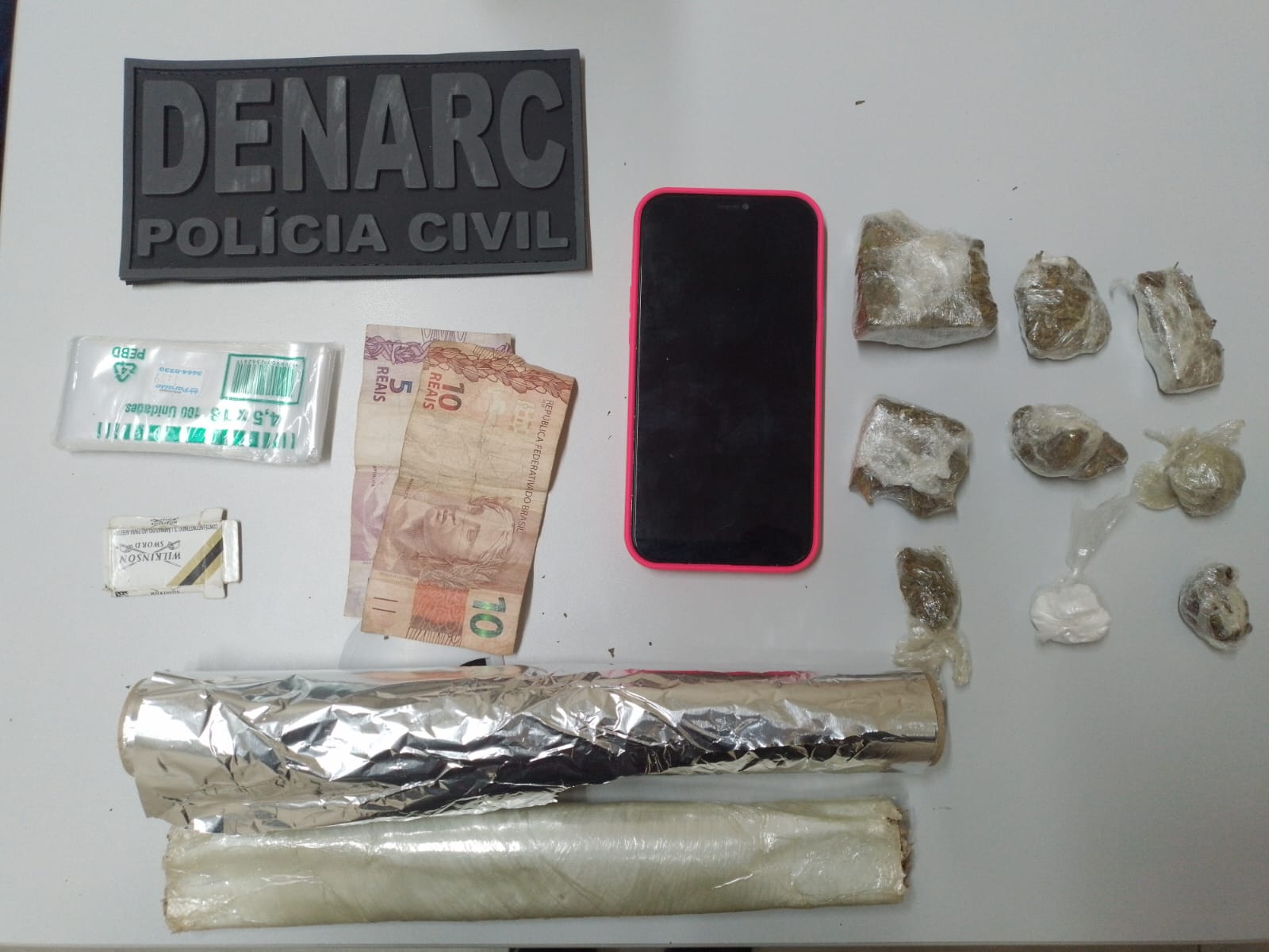 Apesar da tentativa de se desfazer da droga, os policiais conseguiram apreender os pedaços de maconha, porções de cocaína, dinheiro fracionado, papel filme e sacos zip-lock.
