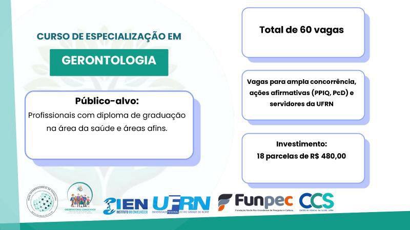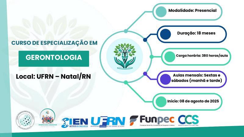 O Departamento de Enfermagem (Denf/UFRN) do Centro de Ciências da Saúde (CCS/UFRN) segue com inscrições abertas para a especialização em Gerontologia, com ingresso previsto para o semestre letivo 2025.2. São disponibilizadas 60 vagas para graduados na área da saúde e afins. As inscrições foram prorrogadas e podem ser feitas até hoje 05 de agosto, por meio do Sigaa.