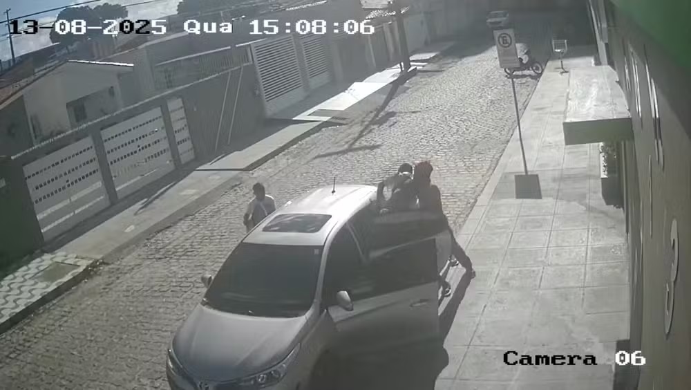 Segundo a Polícia Militar, a vítima foi abordada por quatro homens quando buscava o filho na escola. O crime foi registrado por câmeras de segurança.