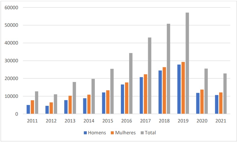 O estudo revela que o fenômeno migratório tomou conta das ruas e aeroportos europeus, ganhando força entre 2011 e 2019. Nesse período, as entradas anuais de pessoas que residiam no Brasil saltaram de 10 mil para 55 mil. Entre os países, destaca-se Portugal, que, de acordo com os dados dos censos, teve um crescimento de 247,5% no número de brasileiros com ensino superior completo, entre 20 e 64 anos.