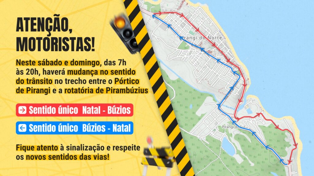 A Prefeitura de Parnamirim, atendendo a solicitações da população residente no litoral, vai realizar, neste final de semana, uma inversão de trânsito na área do Pórtico de Pirangi até a rotatória da Praia de Búzios.