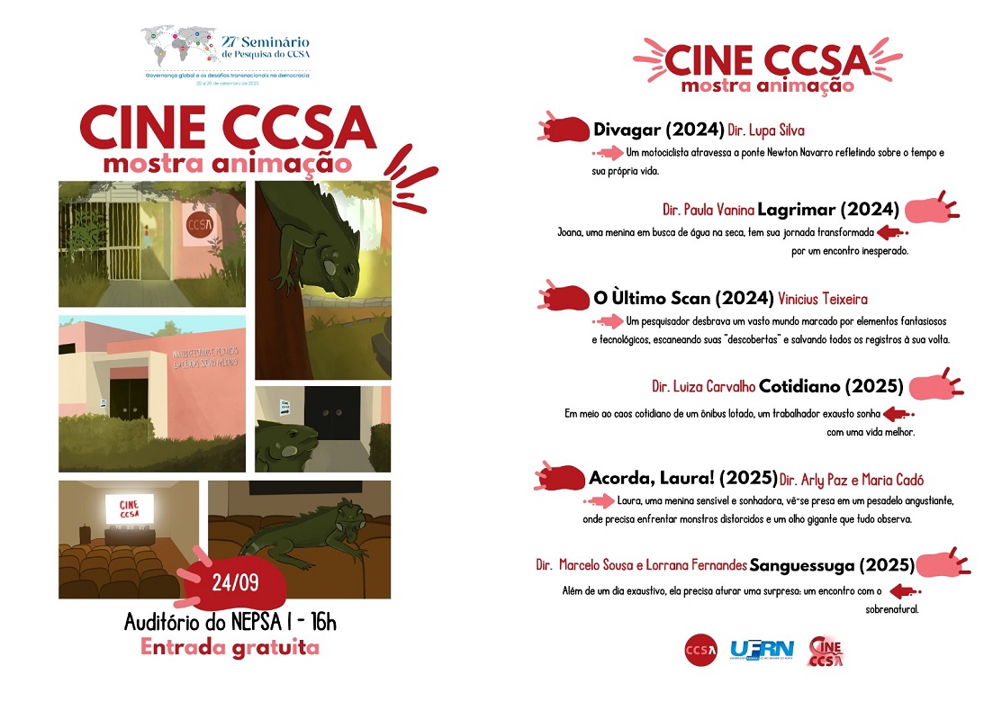 Na próxima quarta-feira, 24 de setembro, o Cine CCSA, projeto do Centro de Ciências Sociais Aplicadas da UFRN (CCSA/UFRN), realiza exibição gratuita de filmes aberta para toda a comunidade, intitulada Mostra Animação. O evento acontece no Auditório do Nepsa I, a partir das 16h.