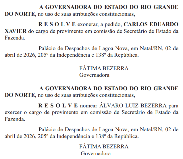 O secretário de Estado da Fazenda do Rio Grande do Norte, Carlos Eduardo Xavier, foi exonerado do cargo nesta quinta-feira (2). A saída permite que o gestor dispute o Governo do Estado nas eleições de 2026. A decisão cumpre o prazo estabelecido pela legislação eleitoral vigente.