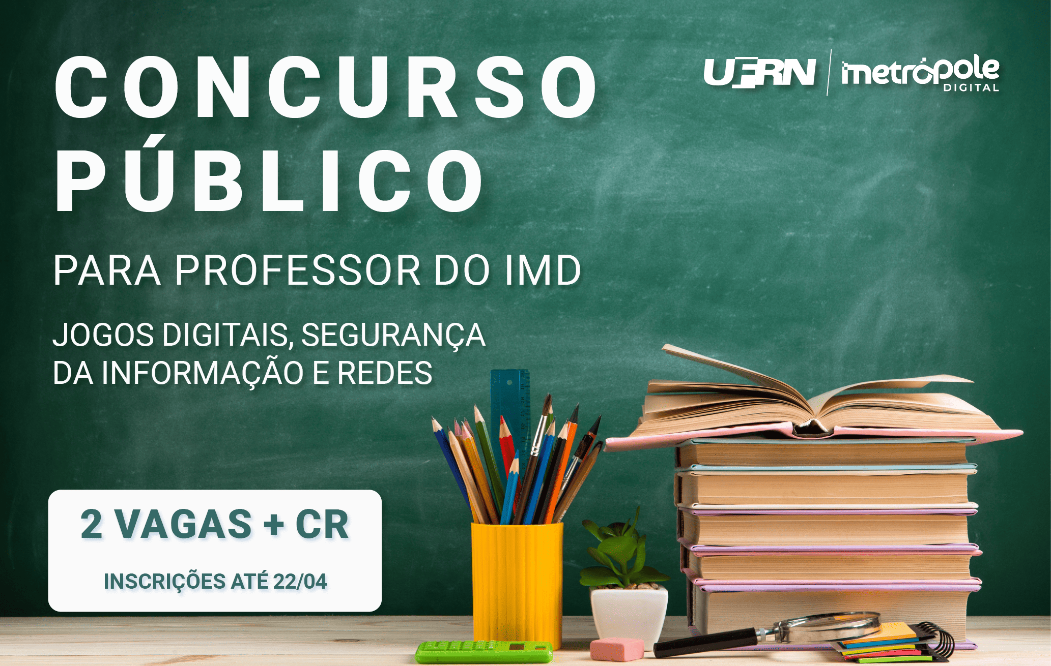 As inscrições para o concurso de professores da Universidade Federal do Rio Grande do Norte (UFRN) seguem abertas até o dia 22 de abril, com duas vagas destinadas ao Instituto Metrópole Digital (IMD). O processo também inclui seleção paralela para cadastro de reserva de docentes temporários, ampliando o alcance da chamada pública.