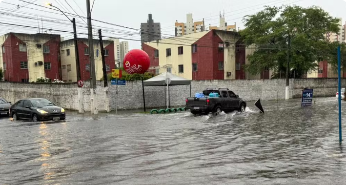 Motoristas e motociclistas enfrentaram dificuldades para trafegar pela Avenida Olavo Lacerda Montenegro durante a manhã. Desde as primeiras horas do dia, a água acumulada tomou conta de um trecho da via e chegou a ultrapassar a altura dos pneus de carros.