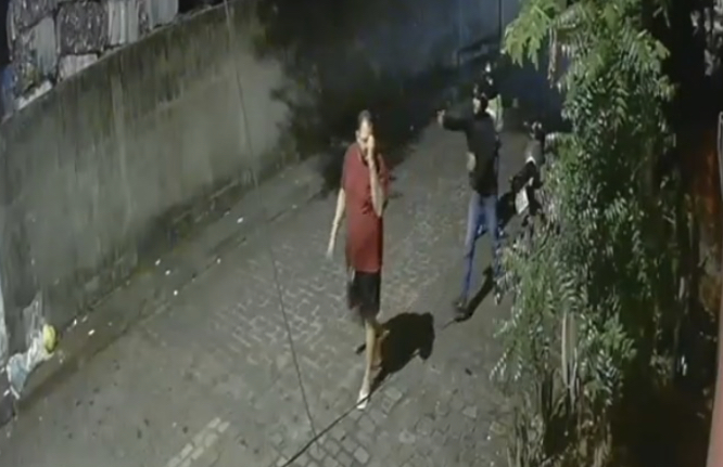 Nas imagens, é possível ver que a vítima se aproxima de duas pessoas que estavam em uma motocicleta. Após um breve contato, o homem vira de costas e começa a sair do local.